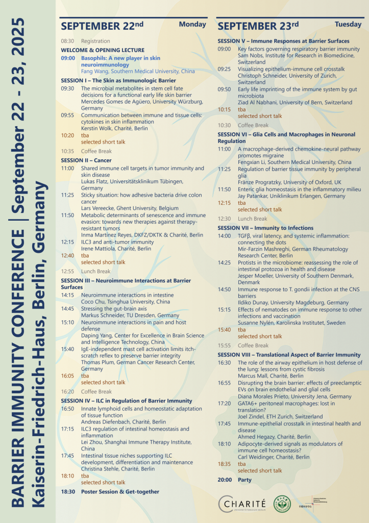 Understanding the complex dialogue between the immune and nervous systems at barrier sites is key to advancing health and treating disease. These dynamic interactions shape how our bodies respond to infection, inflammation, cancer, and pain, and play a vital role in maintaining the integrity of tissues, such as the skin, gut, and respiratory tract. Exploring these early neuroimmune mechanisms can unlock new therapeutic strategies and guide future translational research. The Barrier Immunity Conference 2025 will bring together leading experts to share groundbreaking insights into this rapidly evolving field. Through keynote lectures, invited talks, short presentations, and poster sessions, the two-day event will foster collaboration and drive innovation in barrier immunity research.